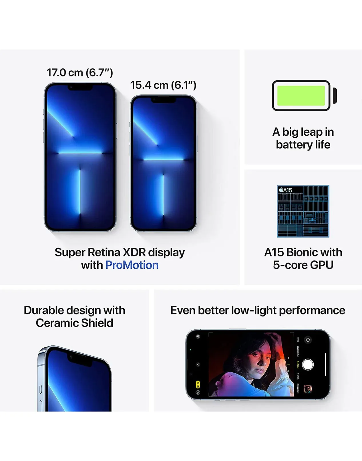 - Processor: Apple A15 Bionic chip (Hexa-core CPU), with a 5-core GPU for enhanced graphics and processing power.