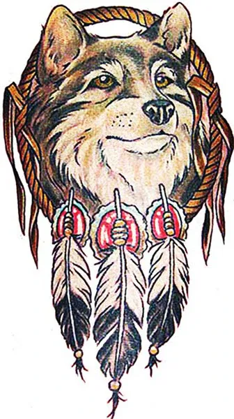 Large Indian wolf with feathers dream catcher temporary tattoo