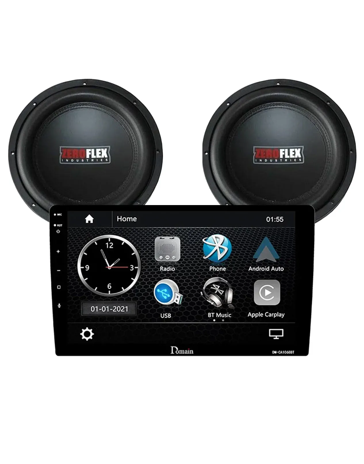 Zeroflex ZFX124 12″ 350RMS 2ohm Slim Car Subwoofer X2 + Domain DM-CA9368BT 9-inch Apple Car Play & Android Car Stereo (Bundle Deal)